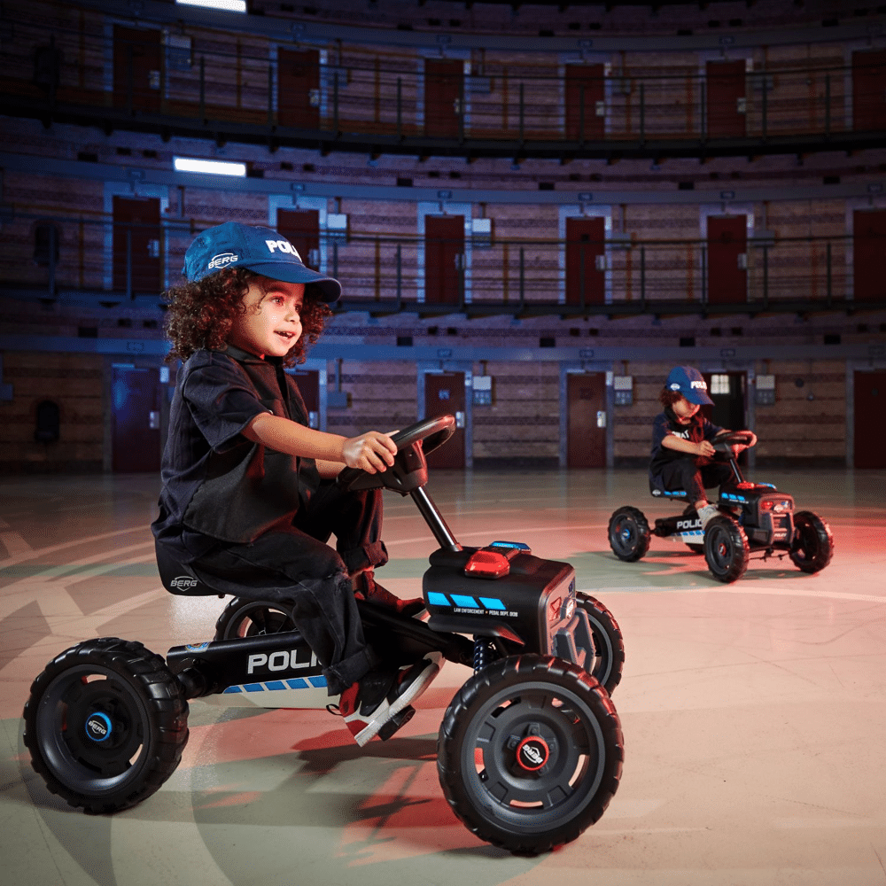 De Buzzy Police, de innovatieve driewieler van Berg met vier wielen. Door het vierde wiel is de Buzzy superstabiel.