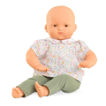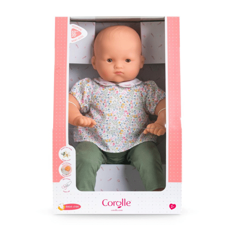 Bébé Chéri is een grote Corolle-babypop om mee te spelen en te acteren als een volwassene.Hij is met zijn 52 cm net zo groot als een pasgeboren baby . Zijn gezichtje, armen en benen zijn gemaakt van zacht vinyl met een delicate vanillegeur.Bébé Chéri heeft een witte huid en hazelnootkleurige ogen. Met zijn slaperige ogen slaapt hij als je hem op zijn rug legt.Zijn lichaam is flexibel om zijn bewegingen te vergemakkelijken.Hij draagt een T-shirt met bloemenprint en een Peter Pan-kraag met de tekst "Baby Darling" erop geborduurd en een saliegroene legging.Hij kan ook echte babykleertjes dragen (maat 3 maanden) of met zelfgemaakte creaties.