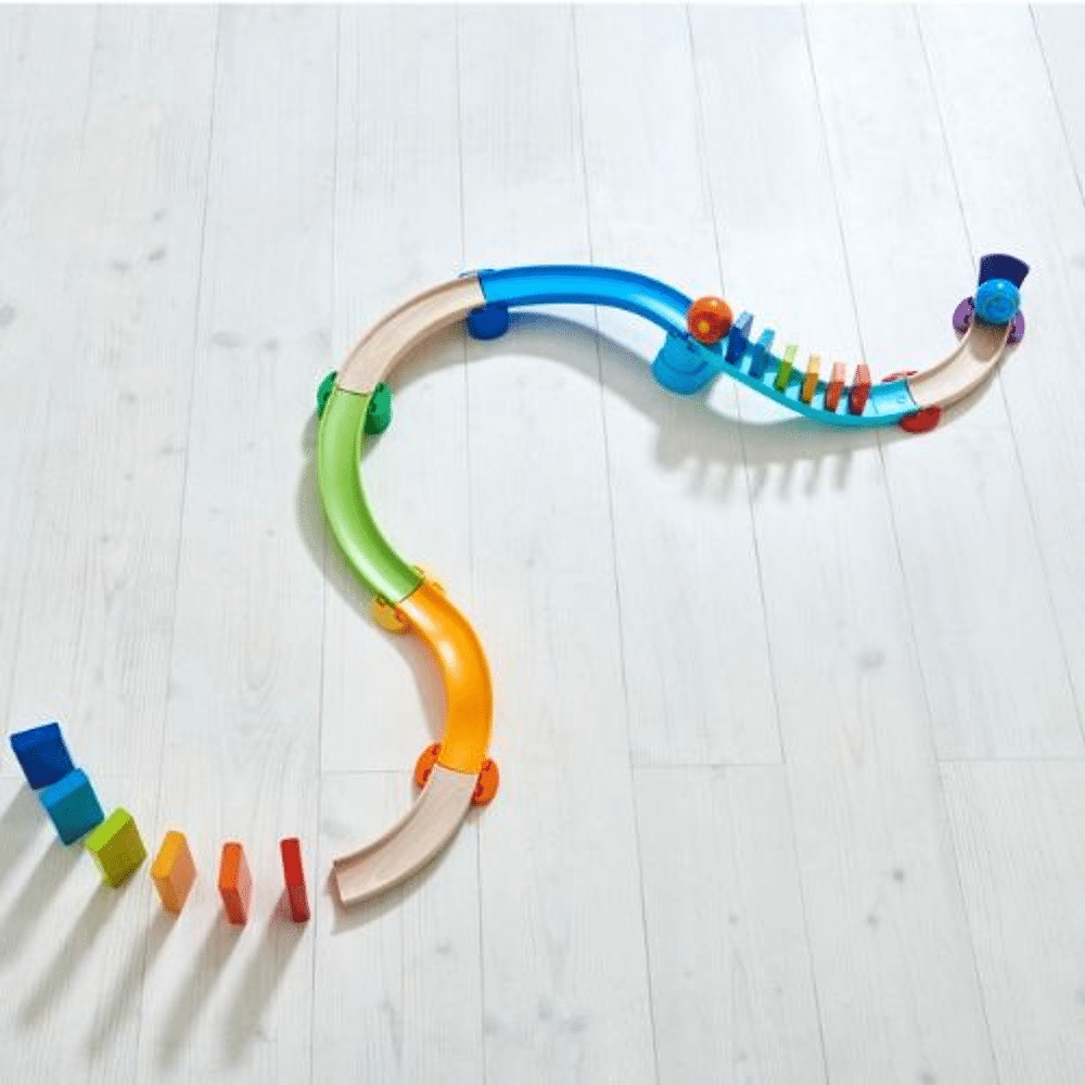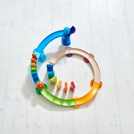 De kleurrijke Kullerbü Kringel Domino knikkerbaan van HABA combineert rolplezier en dominospelletjes: het eerste balletje rolt en, zoef, de kleine dominostenen op de dominotrap vallen één voor één in de mooiste regenboogkleuren om - omhoog of omlaag, afhankelijk van de opstelling. Dan gaat het klik-klak over de domino-trap en met veel vaart schiet de tweede bal door de bochten voordat hij de grote dominostenen omver werpt. Wat een lol als de dominostenen op de grond vallen! Dankzij het slimme kliksysteem is de Kullerbü Kringel Domino-knikkerbaan snel op te zetten en nodigt hij Kuller-fans vanaf 2 jaar uit om er heerlijk mee te spelen.