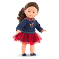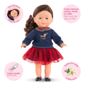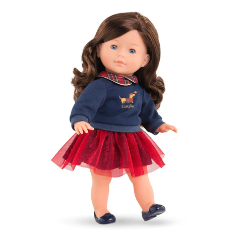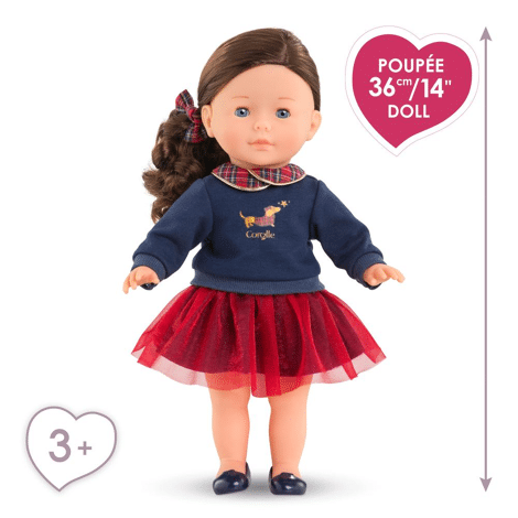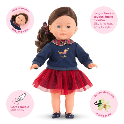Deze ma Corolle-pop is gekleed in een mooie marineblauwe sweater met een elegante geruite Peter Pan-kraag. Een glinsterende zeefdruk van een kleine teckel in een geruite jas geeft haar sweater een schattig tintje. Ze is gekleed in een mooie, zachte rode tule rok. Om haar outfit compleet te maken, draagt ​​ze marineblauwe ballerina's en een mooie geruite scrunchie die bij haar outfit past.Perle Corolle en Fête, een 36 cm grote ma Corolle-pop, in een Limited Edition, heeft een zacht lichaam met "ondergoedeffect" en lang, krullend bruin haar dat gemakkelijk te stylen is. De Perle-pop heeft een witte huid: haar gezicht, armen en benen, met een delicate vanillegeur, zijn gemaakt van zacht vinyl. Ze sluit haar blauwe ogen als je haar op haar rug legt.