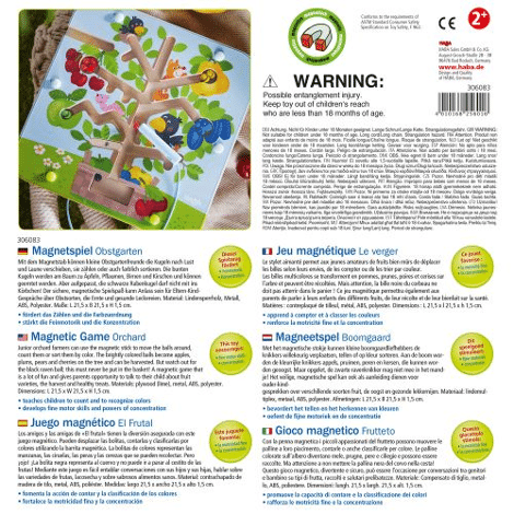 Met het magnetische stokje kunnen kleine boomgaardliefhebbers de knikkers willekeurig verplaatsen, tellen of op kleur sorteren. Aan de boom worden de kleurrijke knikkers appels, pruimen, peren en kersen, die kunnen worden geoogst. Maar opgelet, de zwarte ravenknikker mag niet mee in het mandje! Het veilige, magnetische spel kan ook als aanleiding dienen voor ouder-kindgesprekken over verschillende soorten fruit, de oogst en gezonde lekkernijen.