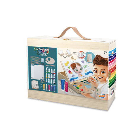 - Inhoud: 1 kunstenaarsschort, 2 dunne A4-doeken, 5 A4-vellen van 230 g, 2 metalen clips om ze vast te zetten, 12 penselen in verschillende maten en vormen, 1 gum, 1 HB-potlood, 1 2B-potlood, 1 houten palet met beker, 18 tubes acrylverf van 22 ml en 5 tubes glitterverf van 20 ml.Met kleuren geïllustreerde gids.