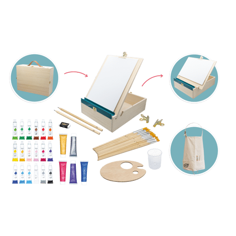 Doe je schort om en leer acrylverftechnieken met deze houten koffer die je kunt omtoveren tot ezel.