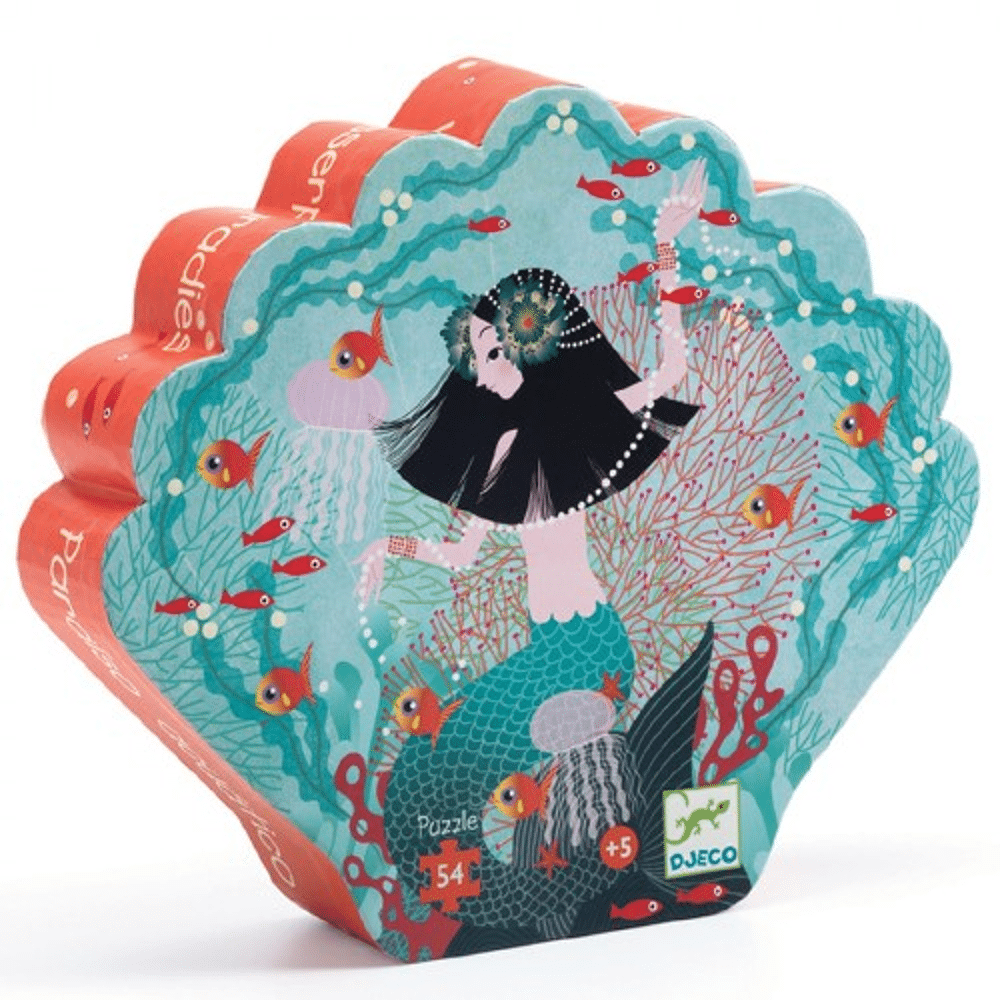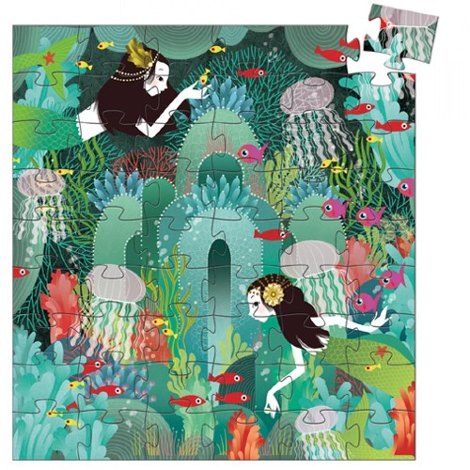 Laten we zwemmen met zeemeerminnen en vissen in een waterparadijs. Een prachtige puzzel van 36 stukjes in een elegante schelpvormige doos.