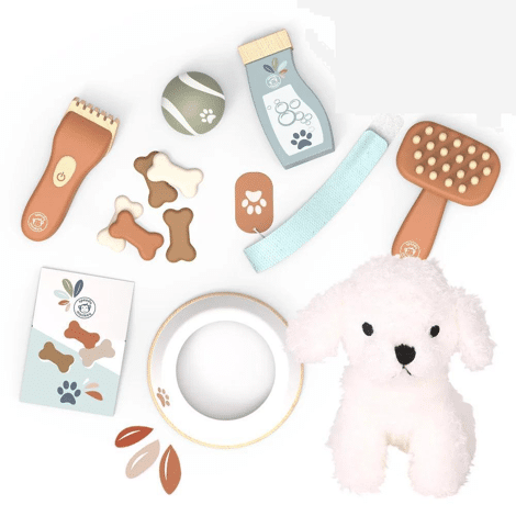 Kinderen hebben alles wat ze nodig hebben in deze prachtig ontworpen koffer om hun favoriete knuffelhond (inbegrepen) te verzorgen.Inclusief hondensnacks, voerbak, borstel, halsband en nog een paar accessoires.Plan je reis en neem alles mee wat jij en je hond nodig hebben voor leuke avonturen!Dit speeltje is gemaakt van duurzaam geproduceerd hout uit FSC®-gecertificeerde bossen en voorzien van een niet-giftige verflaag.