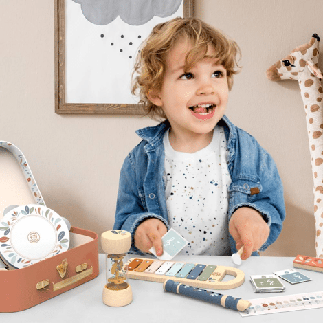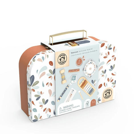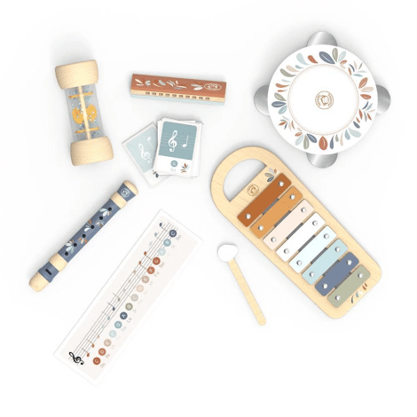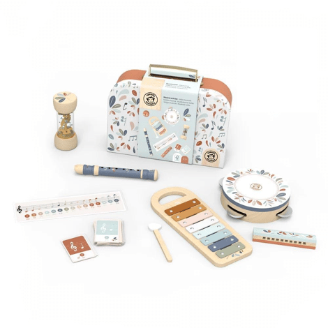 Omdat muziek alle ontwikkelingsgebieden van kinderen stimuleert, zoals creativiteit, en de zintuigen, bevat deze koffer 5 muziekinstrumenten: de xylofoon met acht kleurrijke metalen toetsen, de tamboerijn die een leuk en zacht geluid produceert, de houten regenmaker die het zachte geluid van regen nabootst wanneer de kralen naar beneden vallen terwijl het instrument draait, de kleurrijke blokfluit met niet-giftige en smaakloze verf, ontworpen voor beginners, en de mondharmonica zal kinderen zeker bekoren, aangezien er geen ervaring vereist is.Dit speelgoed is gemaakt van duurzaam geproduceerd hout uit FSC®-gecertificeerde bossen en voorzien van niet-giftige verf.Afmetingen: 17,5 x 17,5 x 4,5 cm