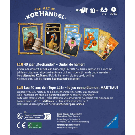 - Inhoud: 40 dierenkaarten, 55 geldkaarten, 1 "lijst", 1 houten hamer, 1 handleiding