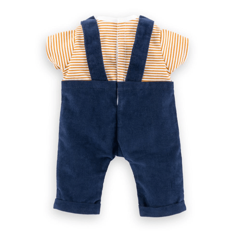 Voor een casual outfit is de marineblauwe set met T-shirt en overall het ideale kledingstuk voor grote 36 cm Mon Grand Poupon Corolle-poppen.Deze set bestaat uit een marineblauwe corduroy overall en een bruin-wit gestreept T-shirt in één. Een mooie zeefdruk van een hond die een bal vasthoudt, maakt deze overall compleet.